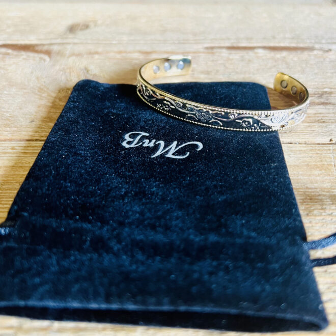 Pure copper magnetic bracelet in an intricate design with a gold and silver finish.
