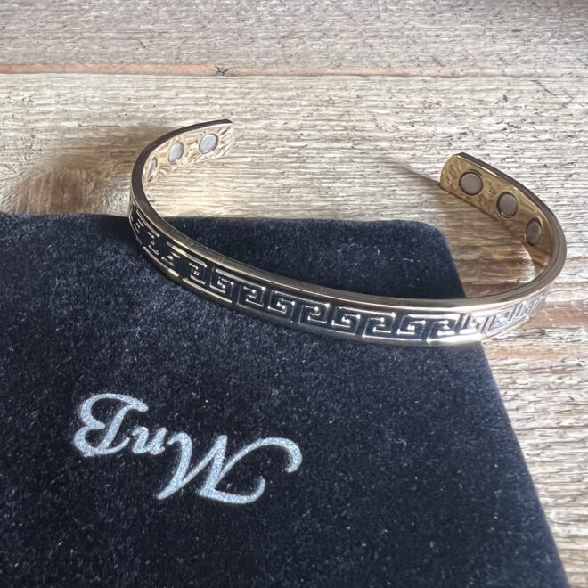 Pure copper magnetic bracelet in a gold finish with a silver greek key style decoration.