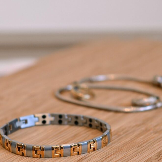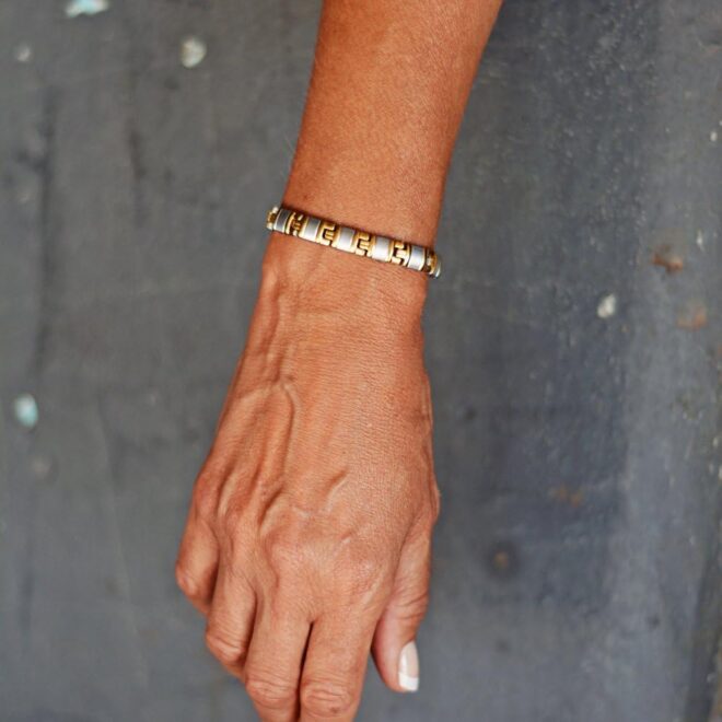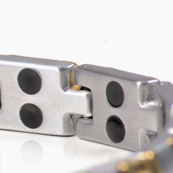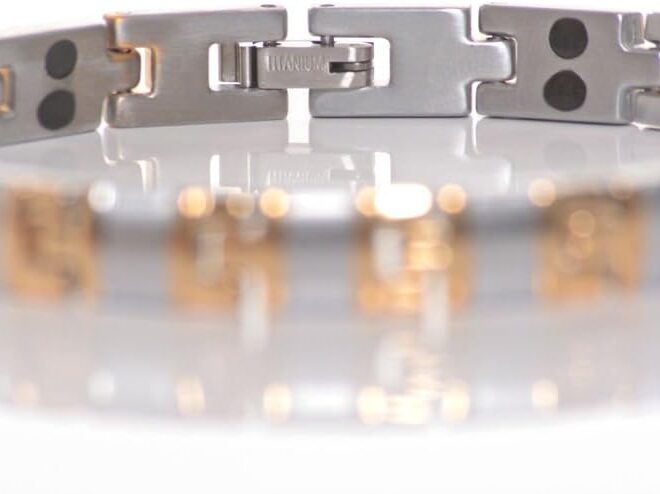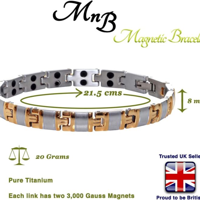 ELEGANT TITANIUM MAGNETIC BRACELET: Beautifully designed hypoallergenic silver and gold coloured titanium magnetic bracelet in a barrel design.